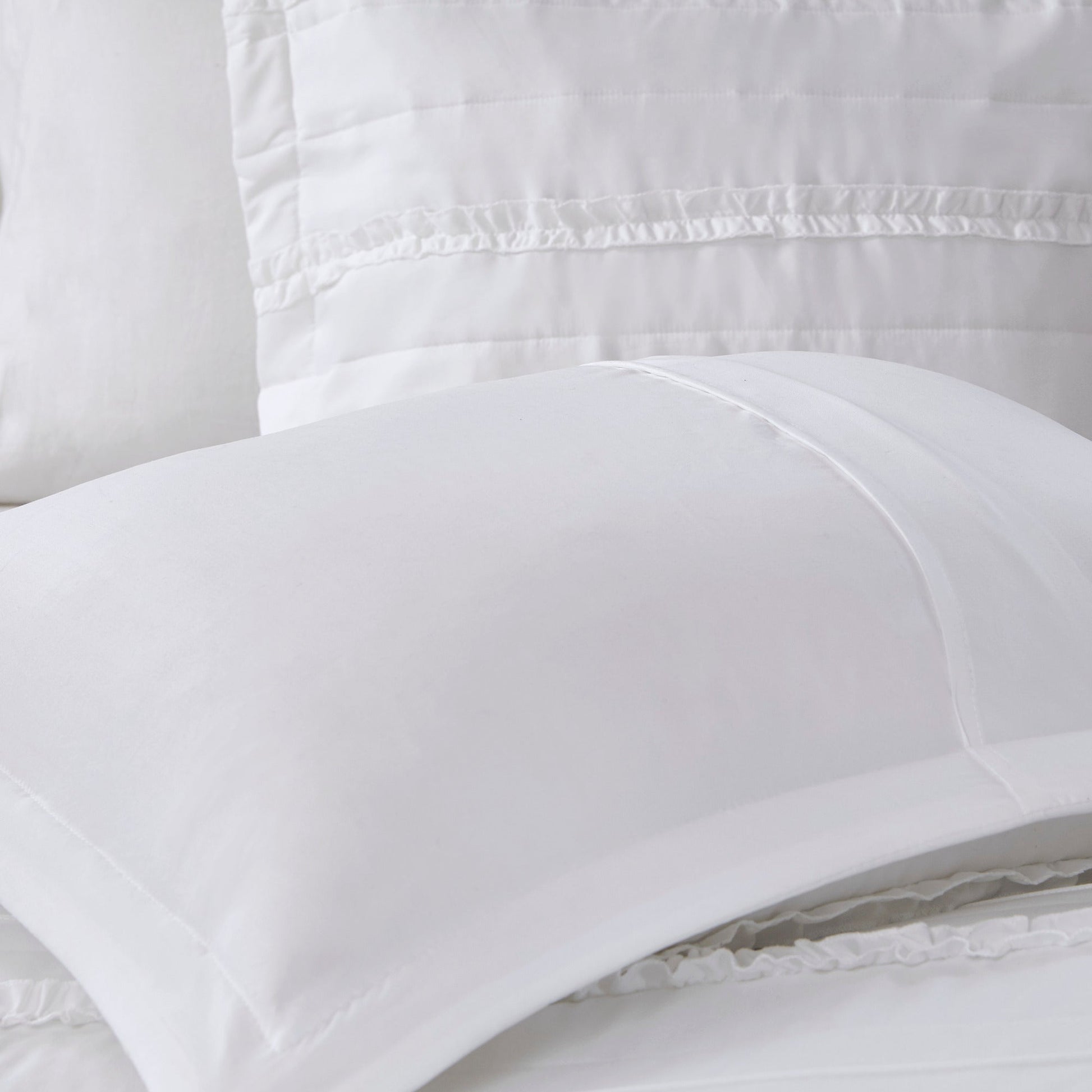 - Features elegant ruffles and quilting design with an embroidered decorative pillow