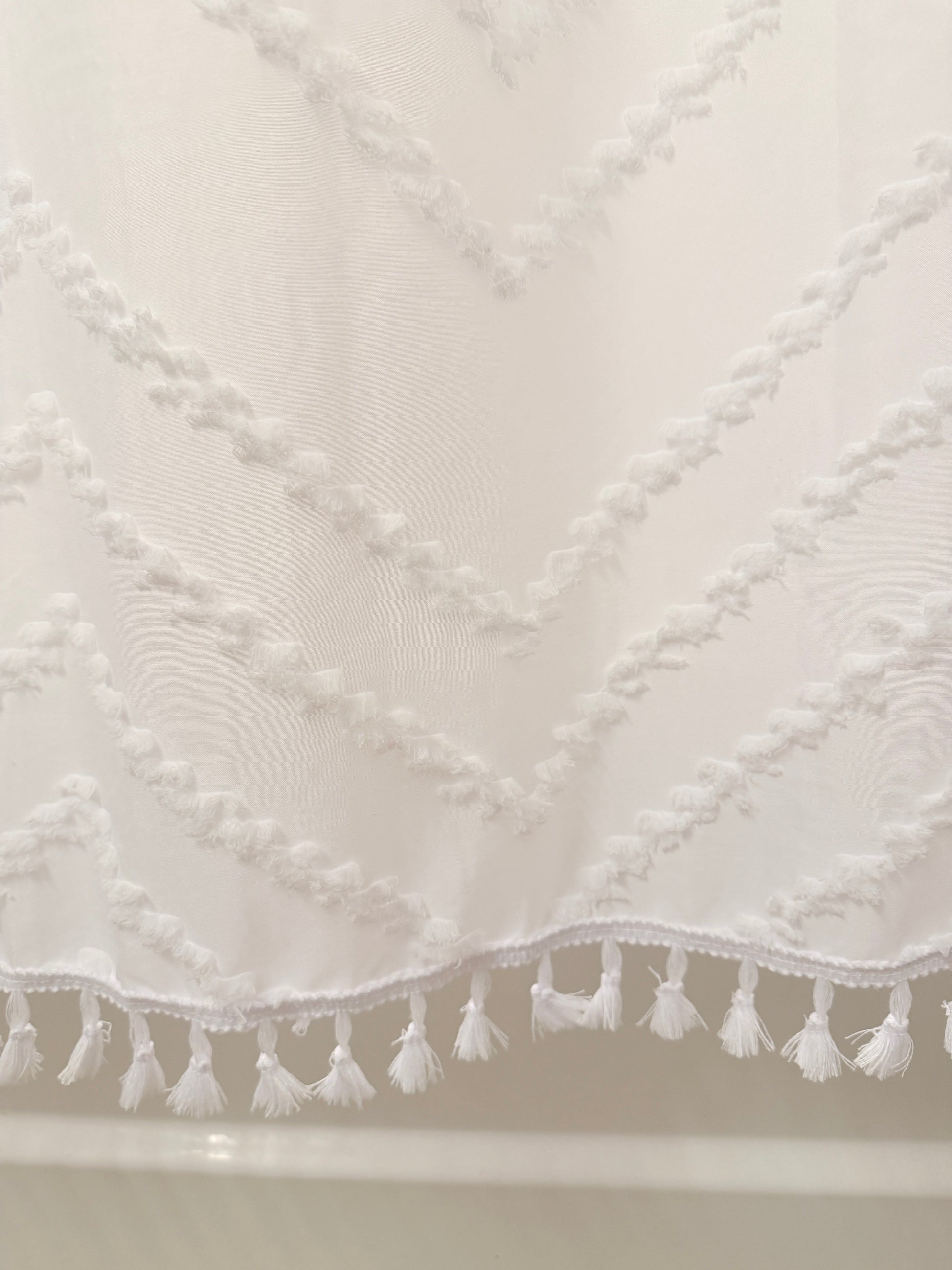 Crafted from soft fabric cloth, this curtain features a raised tufted chevron pattern that adds depth and texture without overwhelming your design. Finished with subtle tassel detailing, it blends modern minimalism with a warm boho feel.