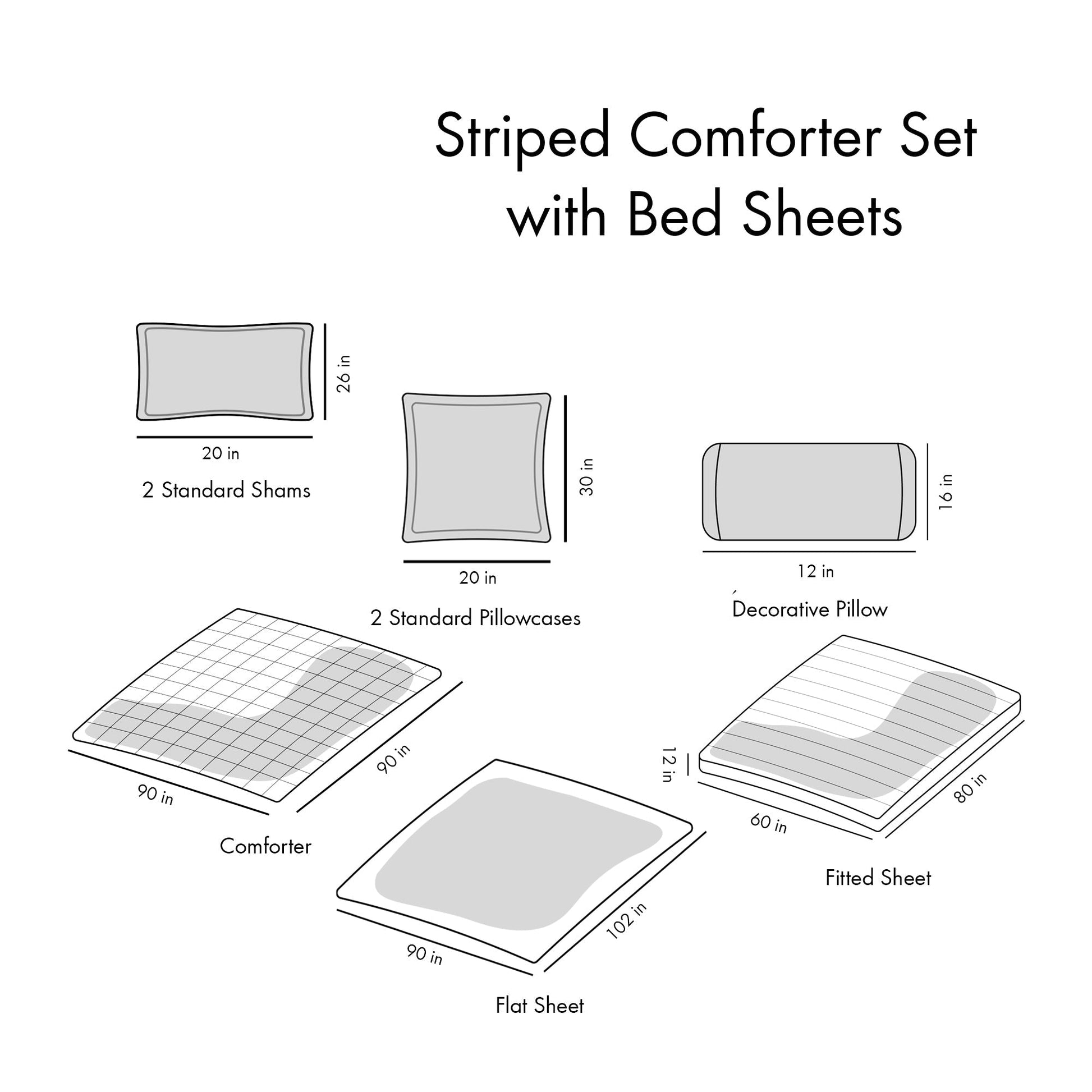 - Includes comforter, shams, 12x16 oblong pillow, fitted and flat sheets, and pillowcases